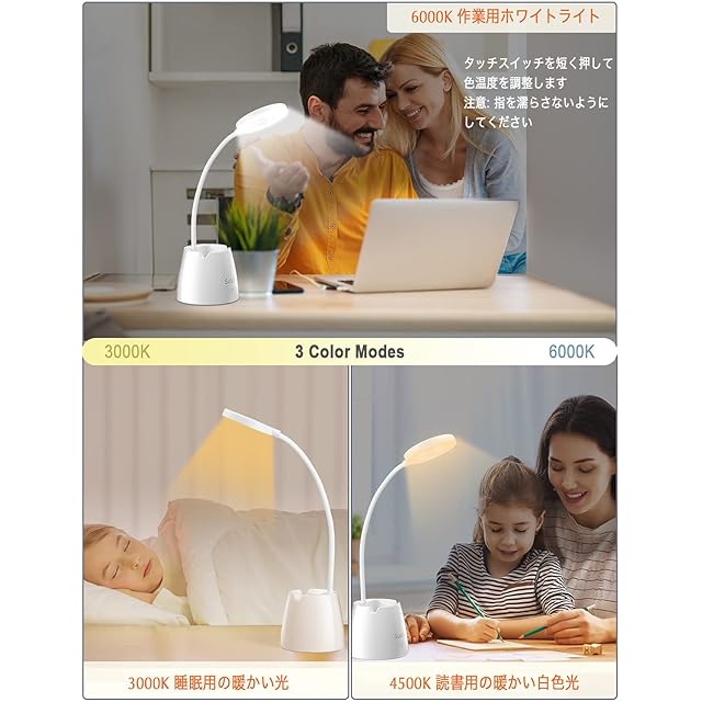 <b>1.輪状デザイン:</b>本デスクライトは輪状デザインを使用し、朝の日差しのように柔らかくて目にも優しい。24個のランプ素子を科学的に設置し光の重ねる影を軽減します。もっとはっきりに見える読書の環境を提供します。 <p><br><b>2. 3つの照明モード(ワンタッチでモードを切り替える)</b> <p><b>白い光モード:</b>色温度は6000Kで、照明条件が厳しく要求されてる仕事に適用します。 <p><b>暖かい光モード:</b>色温度は3000Kで、オレンジっぽく温かみのある光の色。落ち着いた雰囲気になるので夜の読書におすすめ。 <p><b>暖白い光モード:</b>色温度は4500Kで、少しオレンジっぽい白光の色、温かみの雰囲気とともに厳しい照明条件を要求する方におすすめ。 <p><br><b>3.自由に明るさが調整でき、明るさのメモリ機能付き</b> <p>本卓上ライトは3つの照明モードがすべて明るさ調整機能があり、タッチボタンを長押して明るさを自由に調整できます。あなたのニーズに合わせて、もっともふさわしい明るさまで調整できます。一度に電源を切って、再び点灯し、この前に設定された明るさのままに光ります。 <p><b>4.省スペース:</b>本ledデスクライトはミニサイズで、省スペースという点もかなり魅力!