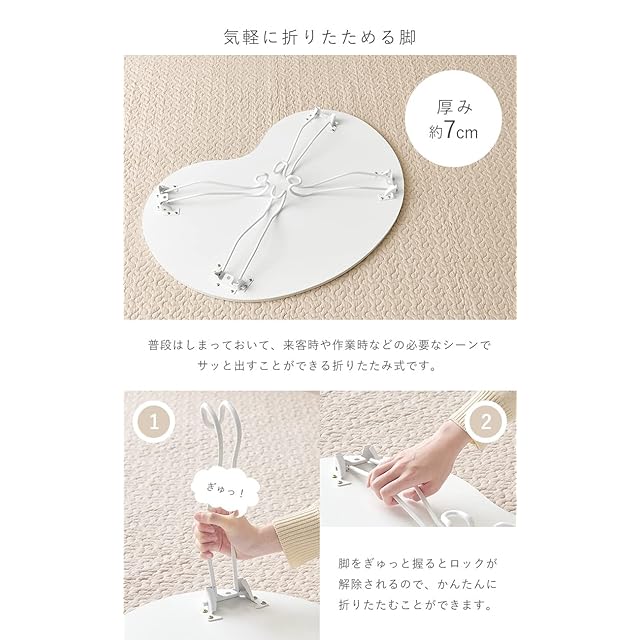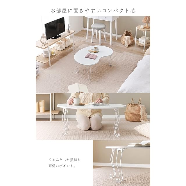 折りたたみ脚のビーンズ型テーブル。 丸形や楕円型とも違うオシャレなデザインの天板がポイント。 真っ白なホワイトカラーと猫脚が甘さを足してくれます。