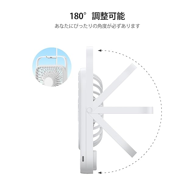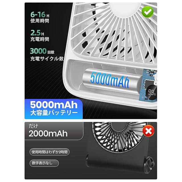 充電式設計で、最大 6-16 時間の連続使用が可能。外出先でも電源を気にせず、快適な風を楽しめます。