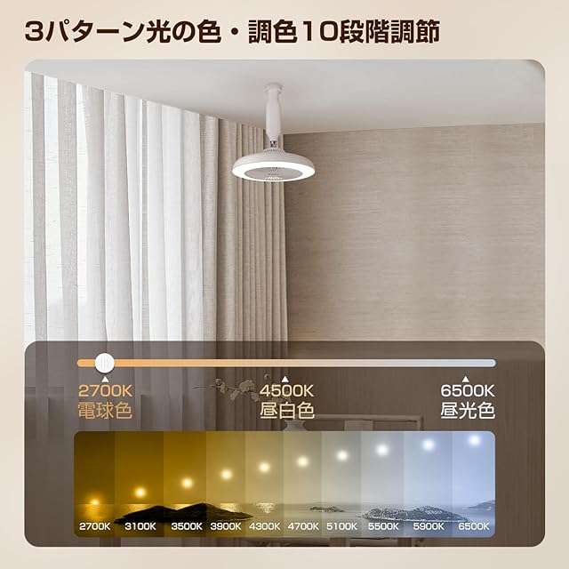 【高演色性・調色/調光10段階・風量調節3段階】高品質なLEDチップを採用し、美しい輝きを放ち華やかな空間を演出します。設置場所によって、昼光色、昼白色、電球色の3種類からを選択できます。リモコン操作でお好みの点灯モードに6500K~2700K10%調色することができて、LED照明の明るさを10%ずつ10段階で調節可能です。使うシーンに合わせて使い分けられます。高品質な羽根によって、肌あたりのよい柔らかい風を実現しましす。3段階風量調節も可能です。