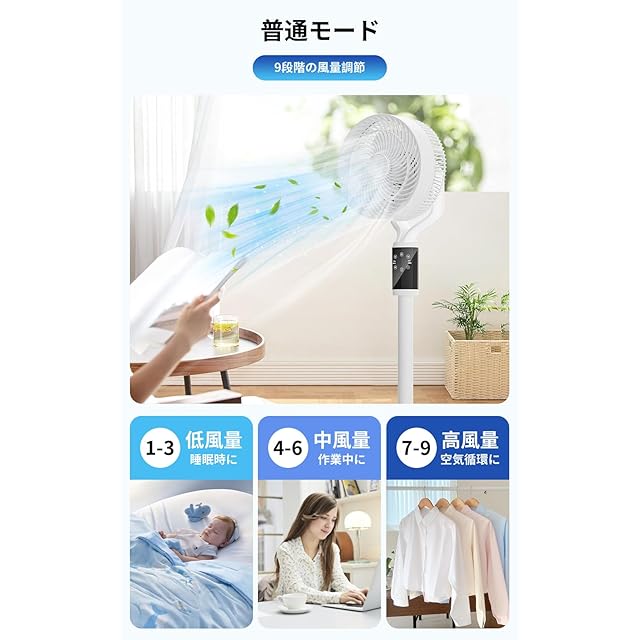 【9段階風量調節&3つの送風モード】手動操作では9段階の風量調節が可能。さらに、用途に応じて選べる「自然風モード」「リズムモード」「睡眠風モード」を搭載。就寝時には静かで優しい風、日中にはリズムのある風など、シーンに応じた使い分けが可能です。(※AIモード時は風速モードの選択不可)