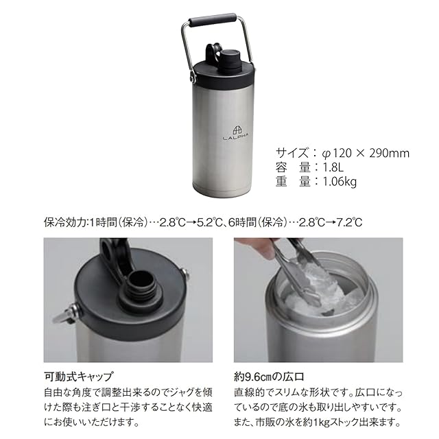 LALPHA (ラルファ) アイスジャグ 1.8L アイスコンテナ 保冷 保温 真空 断熱 氷 ICE Cold Hot対応 ステンレス キャンプ アウトドア CK-180 (シルバー)