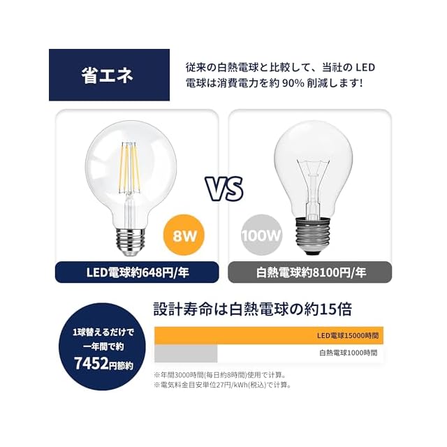 【省エネ&耐久性】消費電力はわずか8Wで、白熱電球80W相当で、従来の白熱電球と比べて電気代を最大90%削減します! 長寿命がLED最大の特性として、15000時間以上の寿命が持つので、頻繁に電球交換の手間も省きます、家計の節約にもつながります。