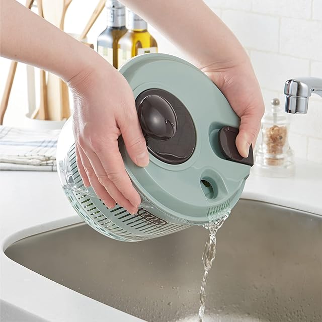 <使い方> ① バスケットに洗った野菜を入れます。 ② ふたをロックしハンドルを回して水切りします。 ③ 水切り穴から排水し完了!