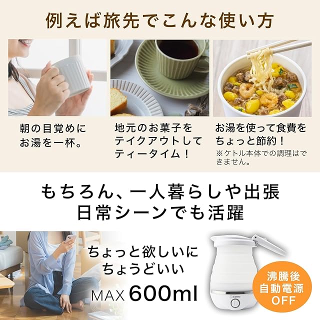 商品名:ドリテック(dretec) 電気ケトル 小型 折り畳みケトル 持ち運び トラベル キャンプ 容量600ml 国内・海外対応 アウトドア 折りたたみ 携帯 車中泊 PO-168WT