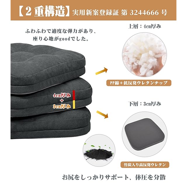 【特許取得済み2重構造】上層に4cm低反発ウレタンチップ+下層に3cm竹炭入り高反発ウレタンを使用(実用新案登録証 第 3244666 号)。上層ふわふわで、ゆっくりお尻にフィット、圧力を分散します。下層はやや硬いで、しっかりと体を支え、底付き感はなし。座布団クッションは低反発・高反発を兼ね備えた弾力とフィット感、長時間座ても疲れにくい。空間にもマッチします。