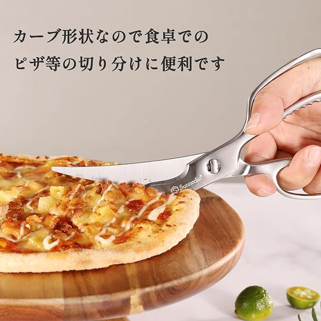 【切りやすい形状】カーブ形状なので食卓でのピザ等の切り分け、包丁では切りにくい肉の脂肪のカットなどに便利です。ハサミの片側の刃は鋸歯状のため、鋭い切れ味が感じられ、もっとスムーズに食材に入ります。硬いものを切るときも滑りにくく、切りやすいです。