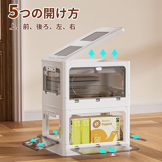 【5面開閉で片手でも操作可能】上部の蓋、前面、後面、左側面、右側面の5つの開閉可能なパネルを備えたデザインです。前面と後面には磁気吸着式スイッチ、左右の側面には従来型の開閉式ドアを採用しており、それぞれ片手で簡単に操作できます。この設計により、収納スペースの多様性と利便性が向上し、さまざまな角度から物を取り出すニーズに応えます。創造性と実用性を兼ね備えた、理想的な家庭用収納ソリューションです。