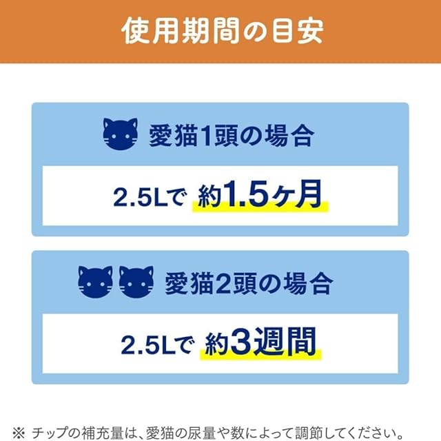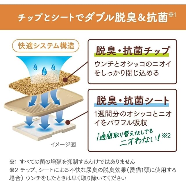 ニャンとも清潔トイレ 脱臭・抗菌チップ 大きめの粒 2.5L×2個セット システムトイレ用 まとめ買い おまけつき<br>針葉樹のチカラで脱臭・抗菌。ウンチと尿のニオイをしっかり閉じ込めます。 ニオイや菌の発生を抑える効果を持つ成分(総称:フィトンチッド)を含む、針葉樹の木材が主原料。粉が舞いにくく、愛猫にもやさしい素材です。香料・抗菌剤不使用。 はっ水するチップは尿で固まらないから取り除く手間なし。尿を残さず、いつでもさらさらをキープ。燃えるごみとして処理できます*。 大きめの粒で飛び散らず、お掃除ラクラク。 システムトイレ各社共通で使用可能。 *ただし、処理の方法が異なる場合がありますので、お住まいの地域のルールに従ってください 商品に関するお問合せ・ご意見は「花王消費者相談室」0120-165-696 受付時間:9:00~17:00(土・日・祝日は除く) 使用上の注意 ●チップを水洗トイレに流さないでください。詰まりの原因になります。 ●チップは食べ物ではありません。お子様や認知症の方などの誤食にご注意ください。 ●用途以外には使わないでください。 ●お子様のいたずらにご注意ください。 ●開封後は、湿気の少ない風通しの良い場所に保管してください。 ●万一、チップがトレーから飛び散ったときはすぐ片付けてください。足をすべらせる恐れがあります。 ●トレーは室内の平らな場所に置いてください。変形等の恐れがあるので、トレーを暖房器具等の火気近くに置いたり、熱湯をかけたりしないでください。 ●トレーが汚れたときは、洗った後、よく乾かしてください(室外では陰干ししてください)。