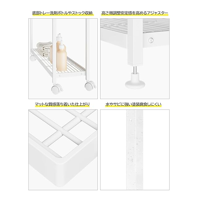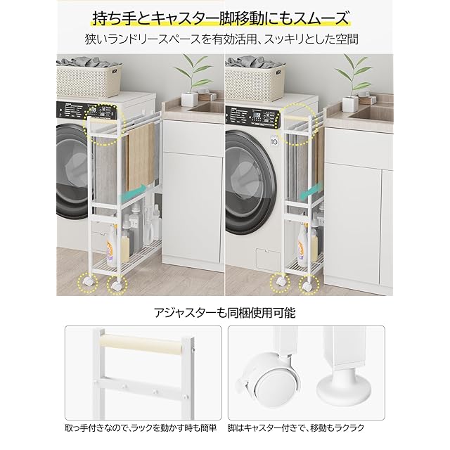【収納スペース拡大】バスタオルを最大4枚収納することができ、中段にはバスマットの収納も可能です。 下部には収納トレー付きで、洗剤のボトルや詰め替え用洗剤のストックなど洗濯機まわりのグッズをひとまとめにできて便利です。
