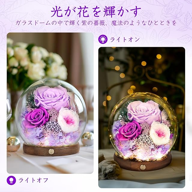 プリザーブドフラワー ガラスドーム 紫色 枯れない花 本物のバラ LEDライト付き アレンジメント 母の日 女性 人気 お花 お祝い 誕生日プレゼント