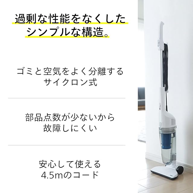 【軽くて、充分に吸う。】私たちが目指したのは、最も手軽で機能的な掃除機です。そのためにはどんな要素が必要で、なにが不要なのかを徹底的に追求してきました。たどり着いた結論は、軽い、必要にして十分な吸引力、そしてお求めになりやすい価格。これを実現させるためにあらゆる技術を凝縮しました。