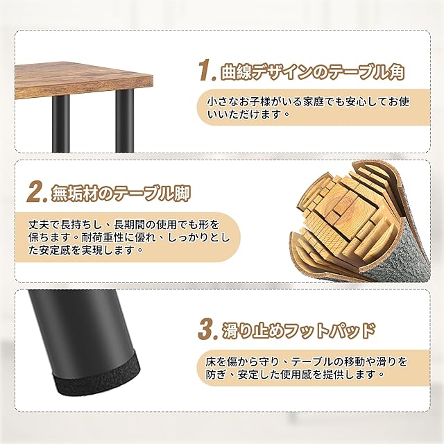 【細部へのこだわり】天板の四角は曲線デザインで、ぶつかる心配がなく、小さなお子様がいる家庭でも安心して使用できます。また、滑り止めパッドが床を傷から守り、テーブルの揺れや滑りを防ぎ、移動時の騒音も軽減します。