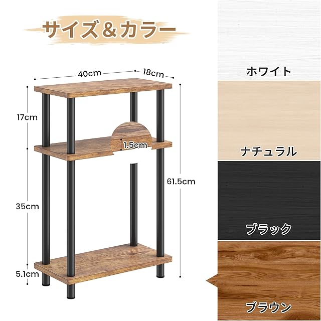 【三段の収納スペース】このサイドテーブルは小さいながらも収納力抜群。2段の収納棚と1つの天板があり、収納力に優れています。最上段は飲み物やランプ、植木鉢などを置くのに最適、中段にはリモコンやティッシュボックスをすっきりと収納できます。最下段は本や雑誌、スピーカーなど大きめのアイテムも余裕で置ける広さを確保しています。