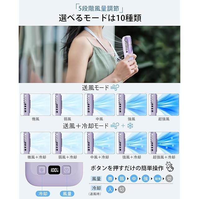 【3段階風量とリズムモード&大容量バッテリー&風量/電池残量表示】ボタン一つで簡単にON/OFF&風量調整。やさしい微風から強風まで選べる風量3段階。風の強弱をコントロールして、より心地良い自然の風を再現した「リズム風」も搭載!強運転連続に比べて、長時間受けたにより冷えすぎを防止できるだけでなく、電力量を効果的に抑えられて省エネです。ハンディ扇風機本体には5000mAhバッテリー内蔵により、一度の充電で一日中ひんやり快適。付属のUSB Type-Cケーブルで充電。アダプタ、パソコンのUSBポート、モバイルバッテリーなどから手軽に充電できてお出かけ先でも安心です。風量/電池残量/低電力/充電中/満充電の場合はデジタル表示されひと目で分かるようになっています。外出先でもパッと見てわかりやすく、充電するタイミングを判断しやすくて安心してご使用いただけます。