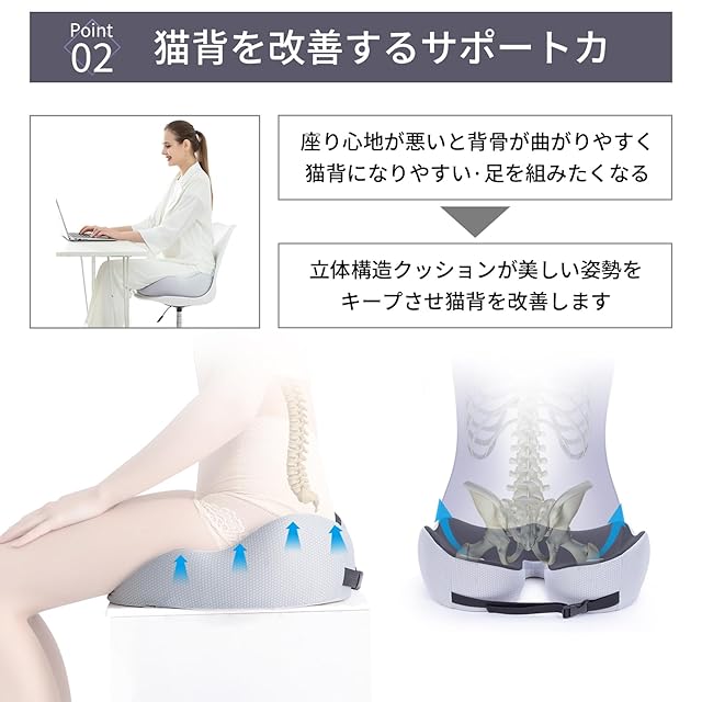<長時間座っている人におすすめ>長時間座って仕事や勉強をしなければならないときは、腰・おしりや太ももが少なからず圧迫されています。この椅子クッションはオフィス、さまざまな椅子用にしても良い、長距離ドライブの車の座席用にしても良いのコンパクトサイズが特徴です。座るだけで正しい姿勢をサポートしてくれる。太もも部分までフィットするため、長時間同じ姿勢で座っていても疲れにくいクッションとなっております。