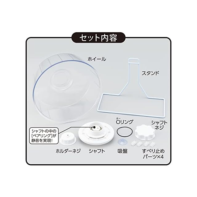 ●すべり止めパーツ付き!スタンドに取り付けてホイールのがたつきを抑え、設置面のすべり止めと、キズをカバー。 ●背面に吸盤をセット!ガラス面に取り付けて固定でき、傾きや衝撃を吸収します。 ●回しやすいシャフトネジ!手に負荷がかかりにくく回しやすいキャップ形状で、ホイールのつけ外しがしやすい。 ●ワイヤーケージへの取り付けも可能。 ※目安として500gを超える生き物には使用しないでください。