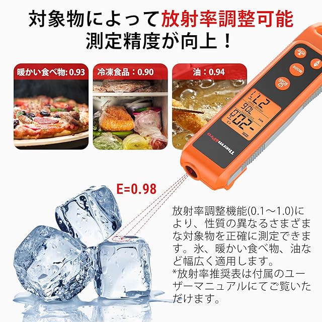 【放射率調節機能で測定精度が向上】温度測定の正確さを向上するために、本製品は従来品より放射率調整機能を追加しております。性質の異なるさまざまな対象物に合わせて、放射率を0.1から1.0まで自由に調整でき、より正確に測定できます。*放射率推奨表は付属のユーザーマニュアルにてご覧いただけます(例:水 0.93;油 0.94;熱い食べ物 0.93;冷凍食品 0.9)。