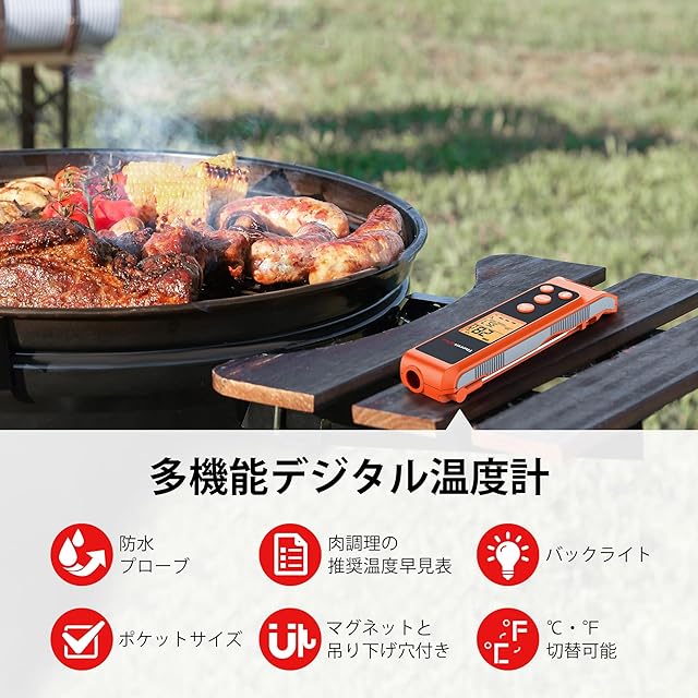 【調理用温度計として】食品グレードの304ステンレス鋼プローブを備えたこの肉用温度計は、ミルクやコーヒーなどのドリンク、お肉、ベーキング、キャンディー、バーベキューなどの調理温度チェックに最適です。赤外線機能を備えたこの放射温度計は、グリドル、ピザ窯、オーブン、グリル、油の温度管理に最適です。