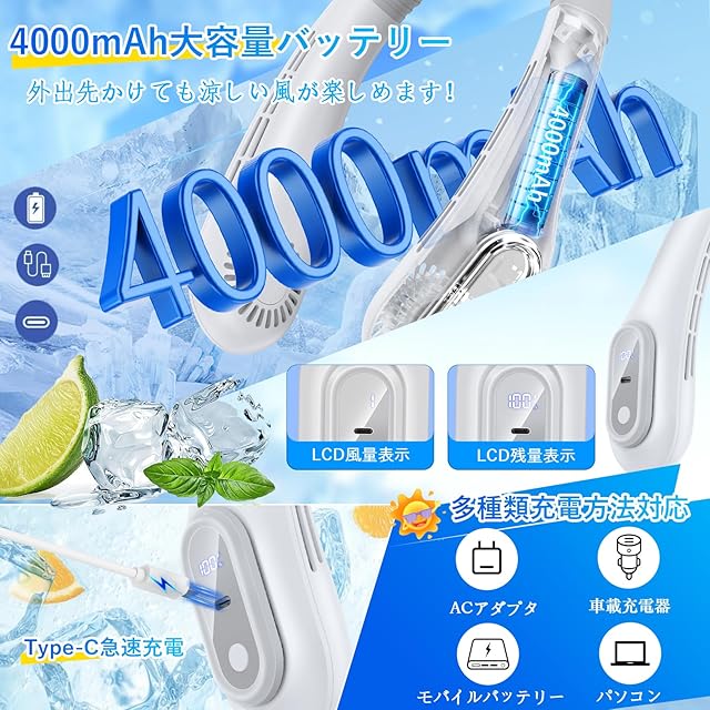 【Type-C充電式&大容量4000mAhバッテリー】ネックファンはType-Cポートを搭載、多様な充電方法に対応、パソコンや充電器、モバイルバッテリーで充電可能で、お出かけ時も安心です。大容量4000mAhバッテリーを搭載され、急速充電設計を採用しており、約4時間の充電で、一回のフル充電で、6~11時間連続運転が可能(風速の状況によっては)、頻繁に充電する手間が省けます。長時間の外出やアウトドアでも一日中涼しさを保ち続け、あなたの代わりに夏の暑さに立ち向かってくれます。