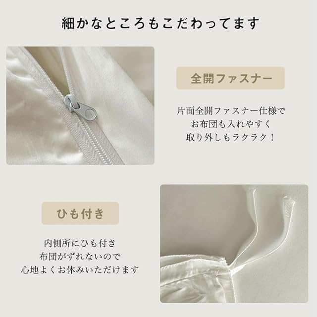 【仕様】:片側ファスナー使用,布団留めひも8ヶ所。素肌に触れるのに最適な100%コットン製サテン仕上げのふとんカバー。優しくふんわりとした肌ざわりに優れた通気性と柔軟性で、快適な睡眠求める方におすすめです。