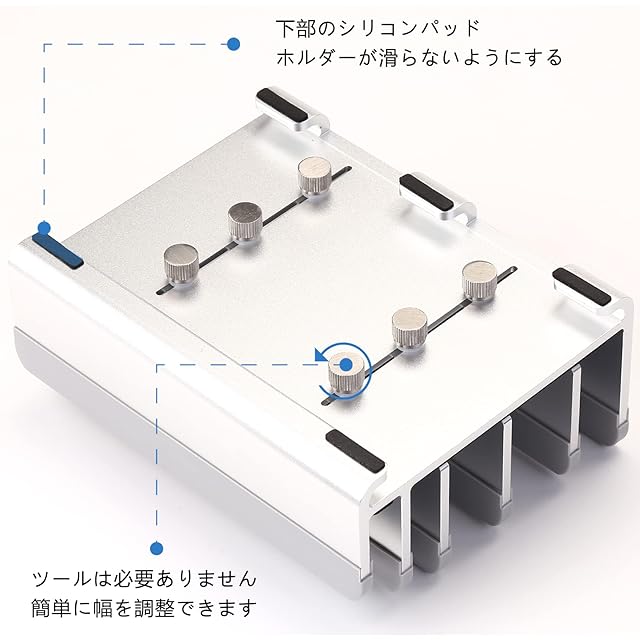 商品名:縦置きで最大5台のデバイスを収納できるノートパソコンスタンド。幅は自由に調節可能で、素材のアルミニウムは、様々なブランドのノートパソコン、ipad、スマホ等と相性が良好です。MacBook Pro/Air/Microsoft Surfaceのすべてに対応し、新デザインを採用しています