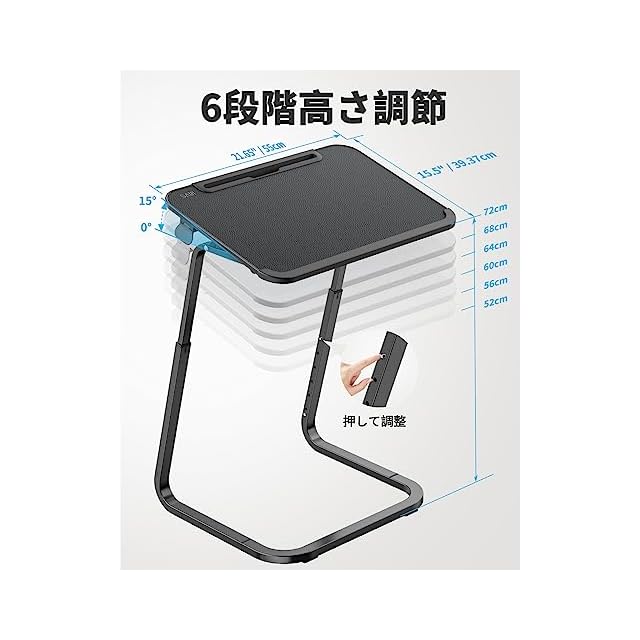 【高さと角度調整】SAIJIの昇降式テーブルは、52.5cmから72.4cmまで6段階で高さを簡単に調整可能。大人から子供まで快適に使用でき、15°の角度調整機能でノートパソコンの使用時に最適な視線を確保します。天板サイズは55cm×39cmと広々としており、ラップトップ、マウス、飲み物、軽食トレイなどを同時に配置可能です。