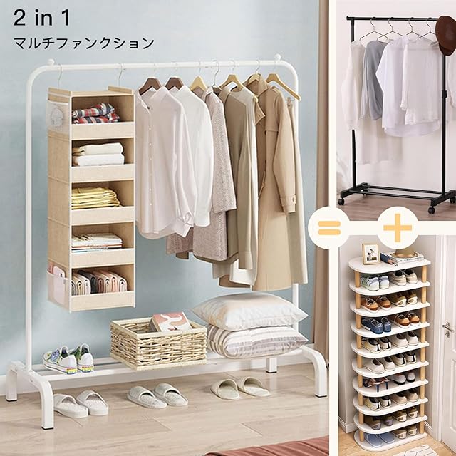 【スペースを活用】:ハンガーラック 狭いお部屋でもスペースを効果的に活用して、靴、帽子、衣類などを整理整頓できます。ロングコートやワンピースなどの長い衣類も十分に収納可。
