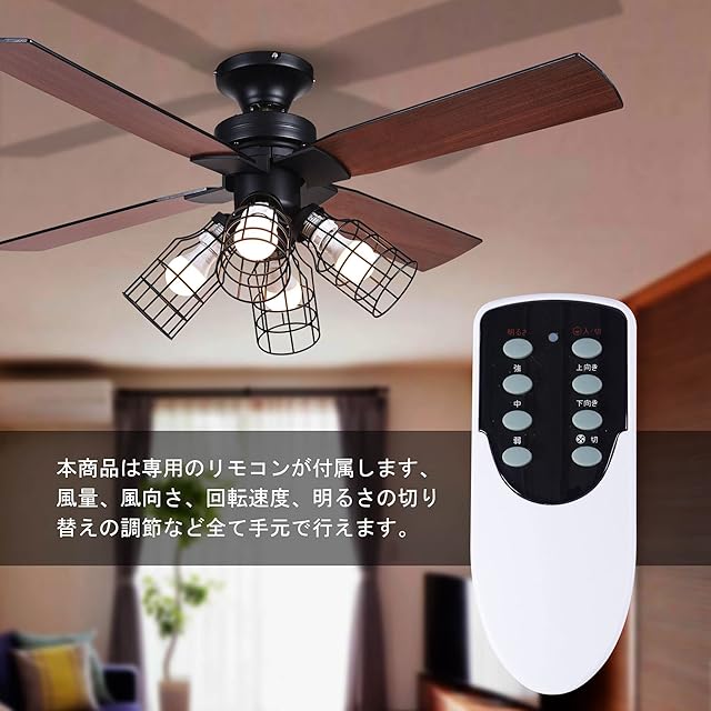 【お部屋の明かりをコントロール】本商品は専用のリモコンが付属します、風量、風向さ、回転速度、明るさの切り替えの調節など全て手元で行えます。点灯する電球を変更して明るさを調整できます、リモコンの風向き切替ボタン、回転速度切替ボタンを操作することで風量や風の向きを変更可能です。これ一つで、お部屋の明かりをコントロール!