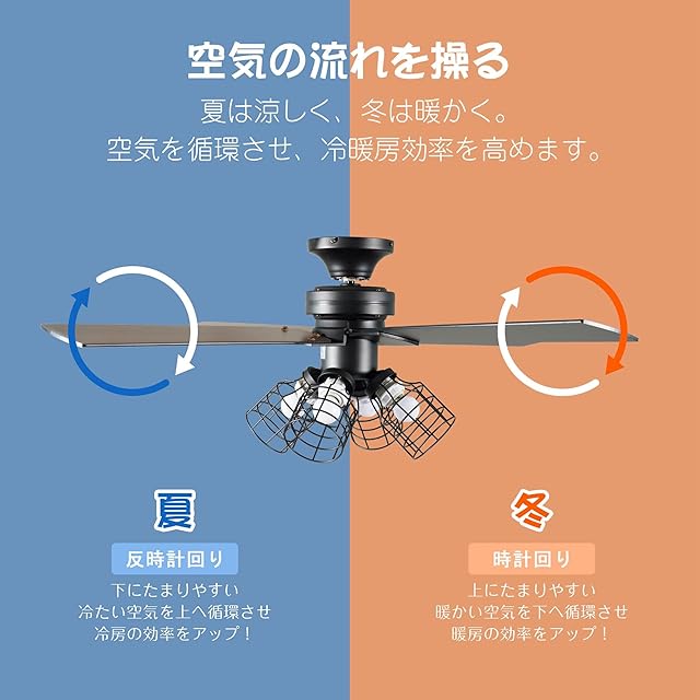 【空気の流れを操る】シーリングファンライトの特徴の一つ「サーキュレーション効果」、お部屋の空気を循環させることで、冷暖房効率を上げる動きをします。暖房時は天井付近にたまった暖気を下向きに循環、冷房時は床付近にたまった冷気を上へ循環させてくれるので冷たい空気や暖かい空気は室内の上下に滞留しがち、そんな偏った空気をかきまぜて、効率よく空気を循環させることによって冷暖房効果を高められるのがこの商品の最大の魅力です。