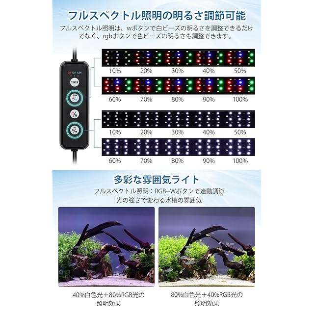 【タイマー機能とメモリー機能】本製品は、5時間・10時間・12時間の3段階に設定可能なタイマー機能を備えたアクアリウム ライトです。一度設定すれば、毎日同じ時間に自動で点灯・消灯を繰り返すため、日々の操作が不要でとても便利です。たとえば、午前8時に5時間タイマーを設定すると、午後1時に自動で消灯し、翌日以降も毎日同じスケジュールで作動します。さらに、停電時のメモリー機能も搭載しており、電力が回復した際には、停電前の明るさや色を自動的に復元します。再設定の必要がなく、快適な水槽 led 照明が継続できます。