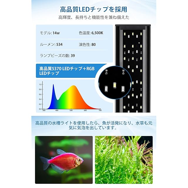 【伸縮可能なブラケット・品質】 水槽ライトのブラケットは伸縮可能で、水槽のサイズに応じて簡単に設置できます。AQQA水槽ライトは、高輝度、フルスペクトル、多機能、長寿命、使いやすさなど、多くの利点を備えた高性能な多機能水槽ライトです。魚の飼育や水草の育成に最適な選択肢となります。この水槽LEDライトには1年間のが付いており、期間中に品質上の問題が発生した場合は、いつでも弊社までご連絡ください。24時間以内にご返信し、迅速に対応させていただきます。