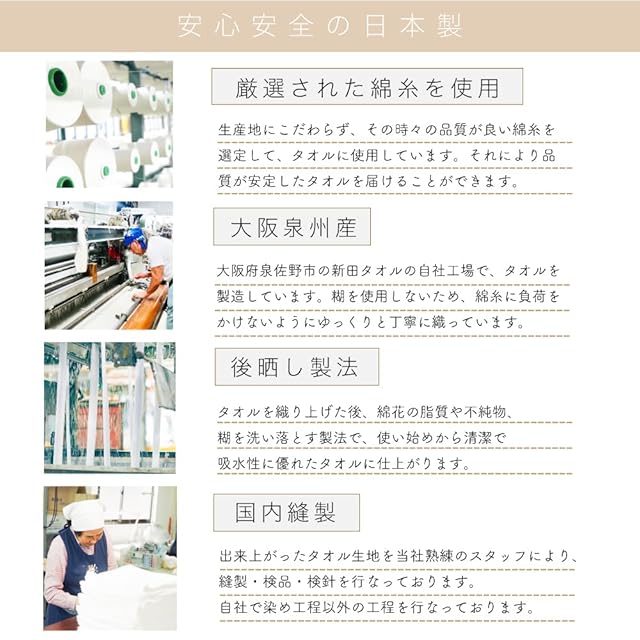 【日本製へのこだわり】国内紡績メーカーKBツヅキの糸を100%使用しています。出雲大社で有名な島根県出雲市で作られています。糸から国産の純国産タオルです。