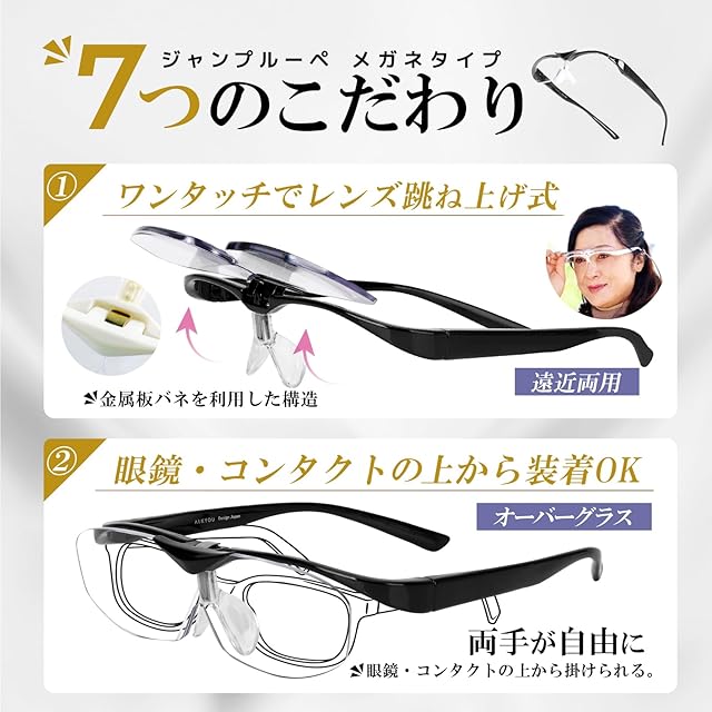 ✅【メガネメーカーが本気で作った!ワンタッチで跳ね上げ式おしゃれなメガネ型ルーペ】見にくい小さなモノを見るときに活躍するメガネ型「ルーペ」。メガネ型ルーペにはいろいろな形がありますが、本製品の最大の特徴は、ワンタッチでルーペレンズ部分をスムーズに上げられるところ。作業を中断するときなど、ルーペを使わない場合はルーペを跳ね上げればいいので、かけ外しの煩わしさを感じることなく使えます。