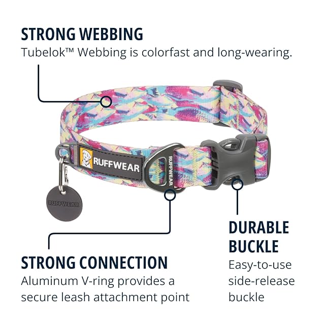 【機能/特徴】サイドリリースバックルで簡単に着脱のできるカラーです。アジャスターをスライドさせて調整しフィットさせます。ラフウェア独自のTubelokウェビングは、色や柄を生地にプリントするのではなく、ジャカード織りで生地に直接糸を織り込んでいるため耐変色性の高い素材です。更に、ロックエッジ加工により耐久性が高くほつれにくいことも特徴です。IDタグ用のアタッチメントはタグがぶつかる音を軽減するシリコン製の素材で作られており、リーシュ取り付け箇所とは別の位置に配置されています。リーシュを取り付けるアルミ製Vリングは高い耐久性でリーシュとしっかり接続します。自然からインスピレーションを得たオンブレパターン(グラデーション柄)が美しい日常使いのカラーです。