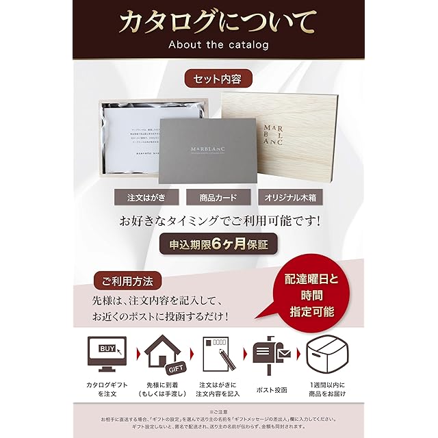 【申込期限6ヶ月で、贈るタイミングも自由自在】 カタログギフトは、6ヶ月の申込期限がされているため、贈られた方は自分の都合の良いタイミングで注文可能です。また、配送の曜日や時間指定も対応しているため、予定に合わせてスムーズに受け取ることができます。贈り物としてだけでなく、ビジネスシーンや感謝の気持ちを伝える機会にもぴったりのギフトです。