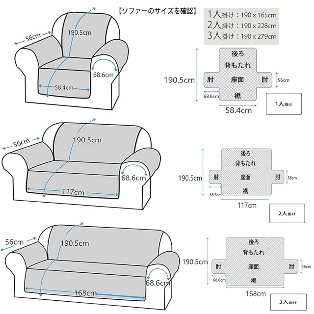 サイズ:一人掛け:190x165cm 二人掛け:190x228cm 三人掛け:190x279cm 。ストレッチ・ポリエステル素材・チェック生地ソファーカバーです。※人工測量なので、多少の誤差がある場合がございます。ご購入前に、ソファーのサイズを測ってから、参考サイズに合わせてください肘の長さを測定しなければなりません。