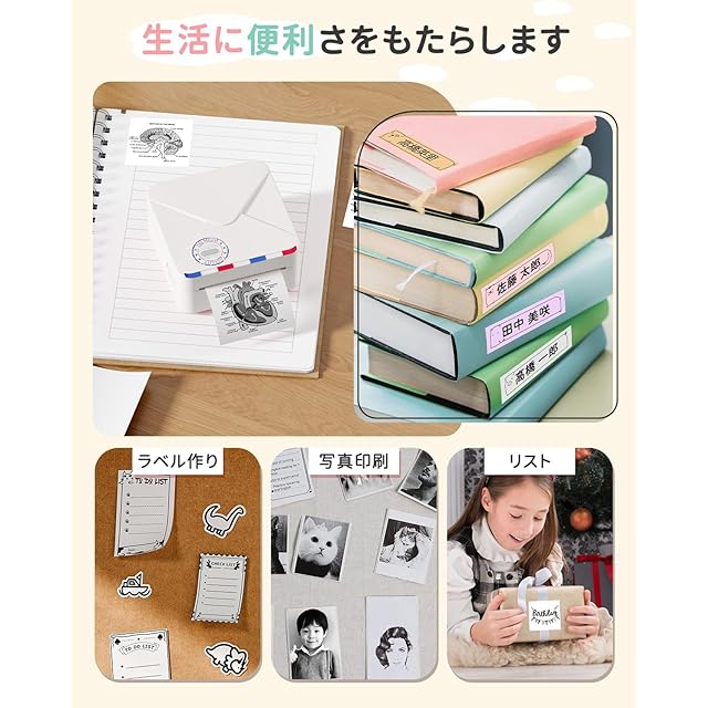 Phomemo M02Sは、高い活用性なモバイルプリンターです。 レトロな写真、可愛い素材、クリアテキストを印刷し、感熱紙に自由にアレンジメントすることができます。場所や用途に合わせて必要なラベルをいつでもどこでも簡単に作成できます。自宅学習と 在宅勤務 も可能です。毎日行った楽しいことや、手帳、メモ、手帳、 年賀状、ラベル、付箋、はがき、家計簿、オフィスなどを気軽にお好きなものを作りましょう