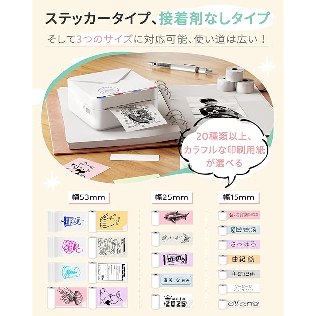 テープ印刷可能:53 mmの印刷用紙を印刷できるだけでなく、整理収納に適した25 mmと15 mmも印刷できます。ラベルボックスのテンプレートを使用し、場所や用途に合わせて自由にテンプレートをお選びできます。お洒落かつ 約40種類感熱ロール紙の印刷を楽しめる