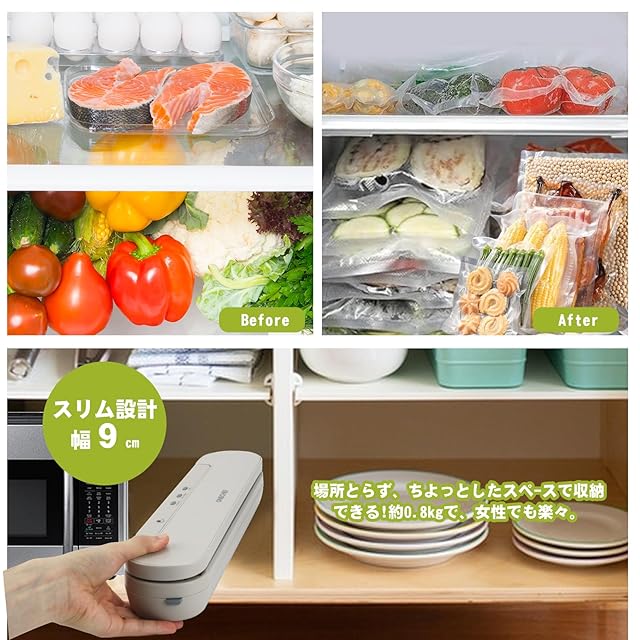 【鮮度を10倍以上持ち】60kPa吸収力で空気を迅速かつ清潔に抽出、ラップの保存より雑菌の増殖を約1/50に抑制することができ、湿気やホコリを有効的に遮断し、酸化などの劣化を効率的に防ぎ、真空脱気により鮮度を最大10倍持ち、賞味期限を10倍延ばし、食品の品質保持に貢献しご家族の健康もお守りします。