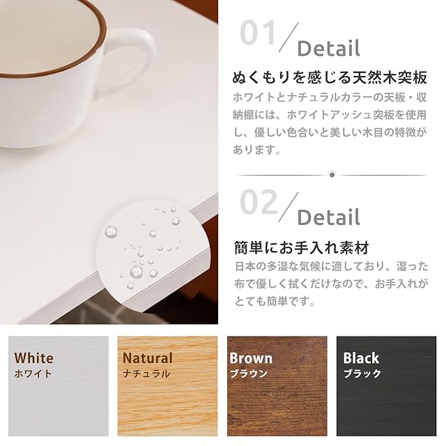 【ぬくもりを感じる天然木突板】ホワイトとナチュラルカラーの天板・収納棚には、優しい色合いと美しい木目が特徴的なホワイトアッシュ突板を使用。天然木の木目や風合いを活かすためラッカー塗装が施されています。汚れた場合は、湿ったタオルで優しく拭けばきれいになります。
