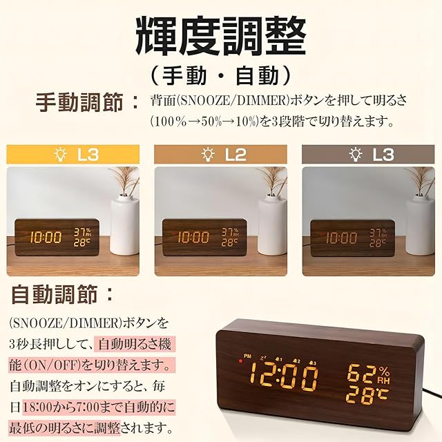 【明るさ調節&省エネ機能】:L手動調光は3段階まで明るさを(明るい、普通、暗い)の調節が可能で、場合によって適切な輝度を自由に選択できます。午後18時-翌朝7時までは表示の明るさが半減します。夜時間帯には明るさが自動的に暗くなり、省エネで目に優しい程度なので、夜中の時刻確認にピッタリ!