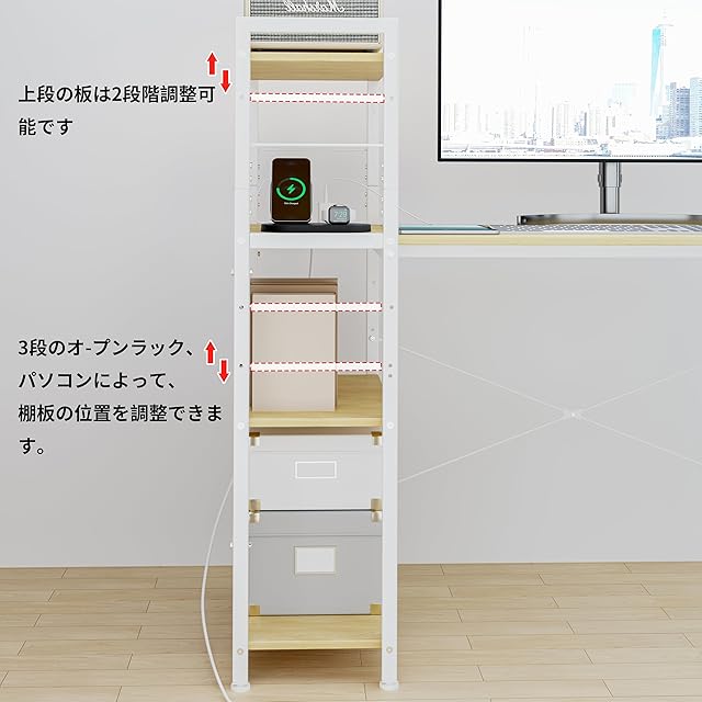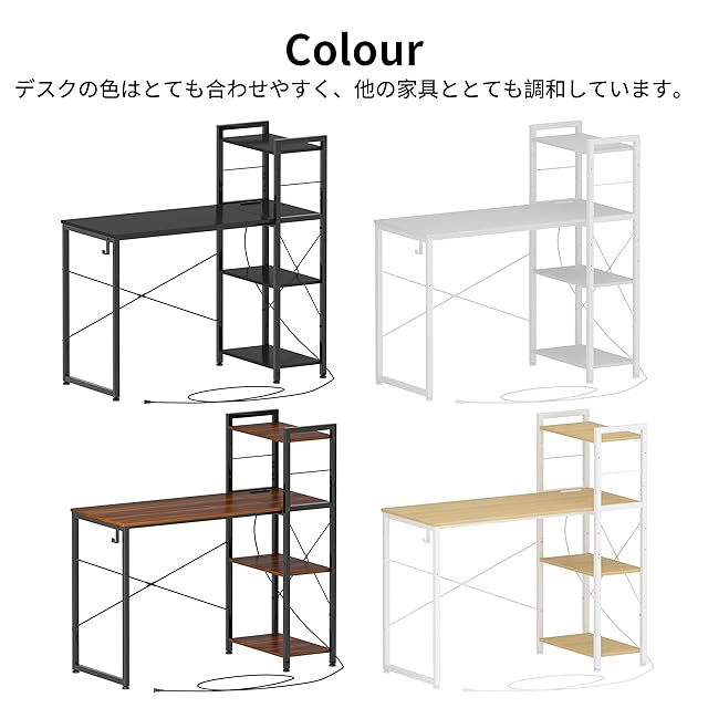 【多機能収納ラック】:4段のオープンラック、パソコンによって、棚板の位置を調整できます。 パソコンや資料を置ける広さの天板で勉強やテレワークに最適。オープンラック一体型デスクは必要なものが見やすく、すぐに取り出せて効率よくデスクワークができます。