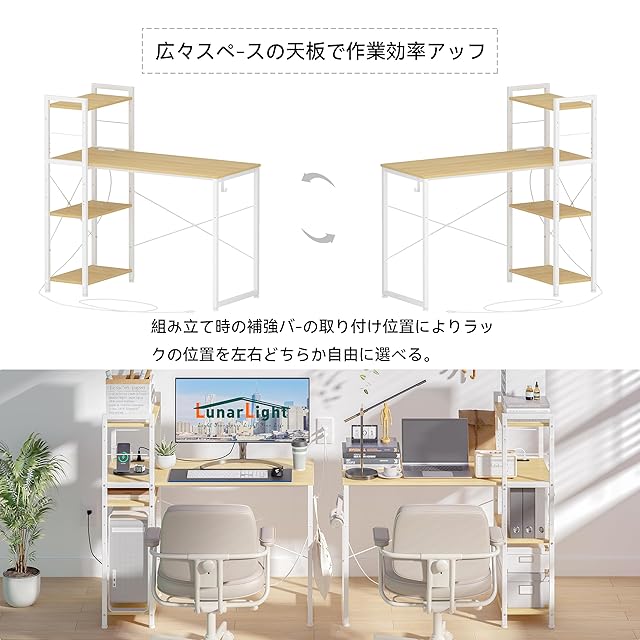 商品名:LunarLight PCパソコンデスク 机 幅110奥行48高さ110cm テレワーク 左右組み換え自由 棚板高さ調節可能 コンセント付き ラック付きデスク 110幅収納たっぷり ゲーミングデスク オフィスデスク 書斎 収納ラック付き(ナチュラル色)
