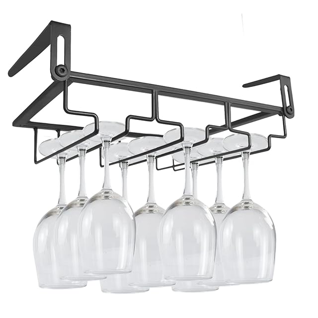 このワイングラスホルダーは、棚板に差し込むだけで簡単に取り付けられ、棚板の厚さに合わせて高さを調節できます。高品質の鉄で作られ、コーティングで防錆処理が施されています。3列のラックには、最大6〜9個のワイングラスを保持でき、ボルドーワイングラスや白ワイングラスなどに適しています。サイズは長さ32cm、幅22.5cm、高さ6.5cmで、棚に合うかどうか確認をお願いします。キッチンで使うのに最適なワイングラスホルダーです。
