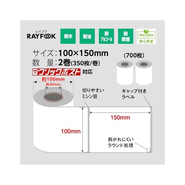 KOGLEE rayfook 感熱ラベルシール クリックポスト clickpost対応 ラベルステッカー 2巻計700枚 A6サイズ相当 約100x150mm (4x6インチ) デスクトップ感熱ラベルプリンター用 FBA出品者向けラベル対応 強粘着タイプ 物流PDラベル。Deli、Zebra、Satoなど市販のほとんどのデスクトップサーマルラベルプリンターに対応しています
