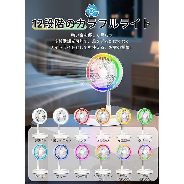商品名:【2025年節電対策・7200mAh電池・12段階のカラフルライト】扇風機 折りたたみ dcモーター 95-1000mm伸縮式 リビング 扇風機 卓上 usb充電式 リモコン付き 静音 高さ自由調節 4段階風量調節 リズム風付き コンパクト収納 室内 アウトドアに適用 (01)
