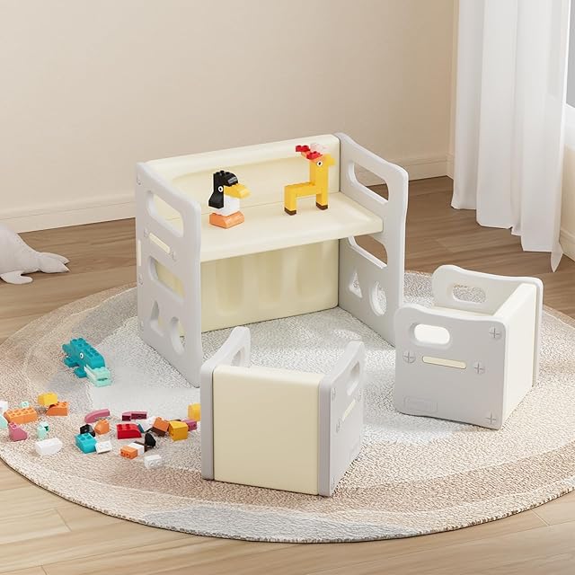 商品名:BanaSuper 子供用テーブルと椅子3点セット アクティビティ デスク チェア プラスチック 多機能 収納 家具 リビング学習/絵かき/ダイニング/プレイセット ホワイトとグレー