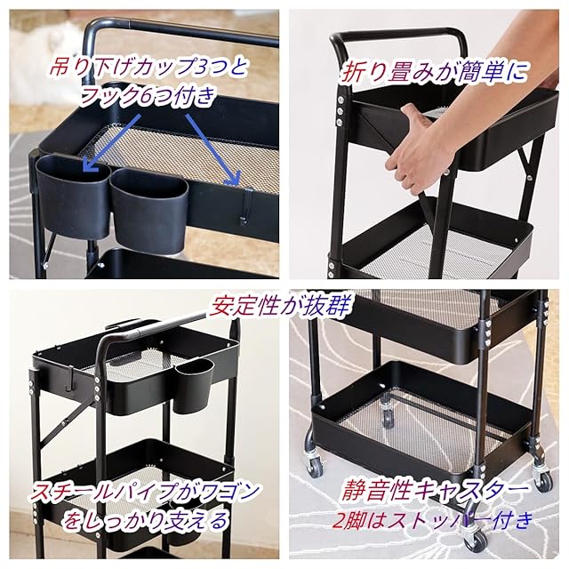 商品名:Secchuu キッチンワゴン 折り畳み 3段タイプ 耐荷重60KG 幅46cm×奥行30cm×高さ82~93cm シンプルさ 収納ワゴン スチール製ボデイ キャスター付き スムース移動 吊り下げカップとフック小物収納 組立商品 (ブラック, 折畳3段)