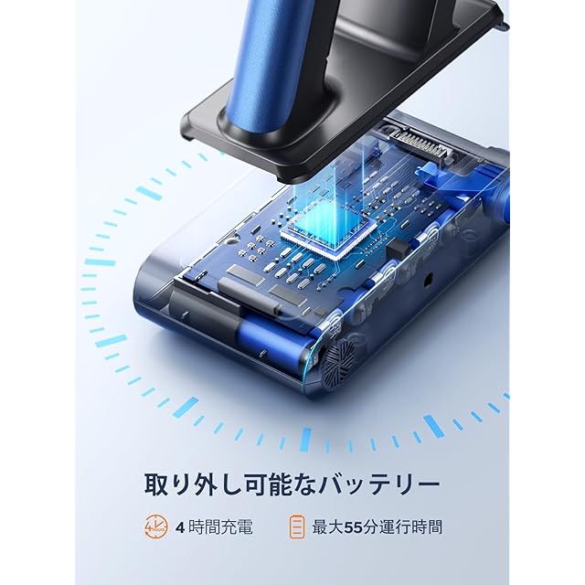 【着脱式バッテリー・4H充電で最長55Min稼働】このコードレス掃除機は7*2200mAhの大容量高密度の着脱式バッテリーを搭載、満充電後最長55分まで連続稼働可能!(最大吸引力の場合は15分になります。)家全体を一気に掃除できる!急速充電も可能、約4時間でフル充電できます。さらに、バッテリーは取り外し可能なので、複数のバッテリーを購入すれば、より長い時間の掃除も可能になります。1DKのひとり暮らし家から、一戸建ての家まで一気に掃除できます。